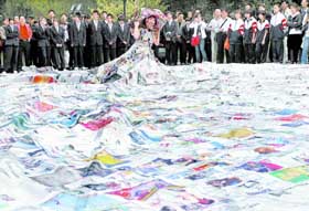 借助吊車和上百位圍觀者的幫助,一位現代藝術家展開了身上200平方米的大裙子,10月16日,這條由舊紙裁剪出的“報紙裙”令人大開眼界。