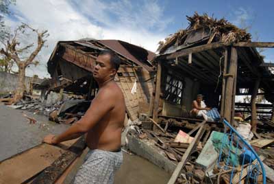 5日,在菲律賓阿爾拜省的一個村莊,災民在整理被臺風毀壞的房屋殘骸。菲律賓國家救災協調委員會5日宣布,強臺風“榴蓮”在菲律賓造成的死亡人數已上升至526人,失蹤者增加到740人。