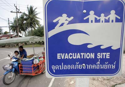 在泰國攀牙府,當地居民騎摩托車經過海嘯警示牌。印度洋海嘯發生近兩年來,受災各國采取各種預警方式,降低災難風險。