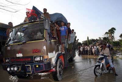25日,在印度尼西亞亞齊的蘭沙,當地居民搭乘汽車離開自己的家園。印度尼西亞亞齊特區官員當天說,當地已有19.8萬居民因暴雨引發的洪災而被迫轉移。