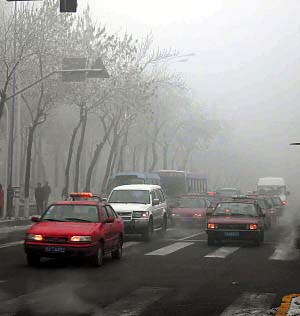 空氣污染造成的大霧讓汽車大白天也得開霧燈。王慧敏