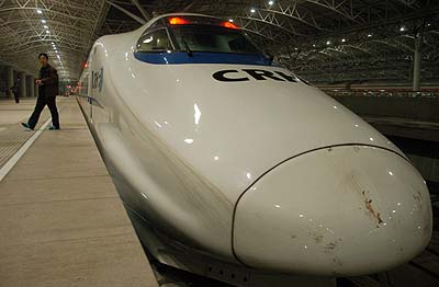 1月15日,新型“子彈頭”高速列車停在上海鐵路南站。當日,新型CRH“子彈頭”高速列車在上海試車,將在2007年春運期間投入使用。