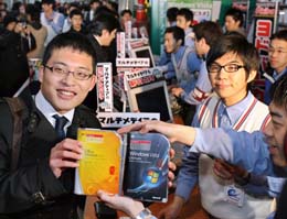 視窗Vista操作系統1月30日零時在日本全國同步發售,但購買了這種產品的用戶報告說,他們安裝Vista操作系統后,不能使用部分網絡銀行服務,也不能正常使用電子郵件。圖為1月30日,在日本東京,買到視窗Vista的日本消費者展示手中的產品。