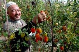 2月5日,維吾爾族農民艾則孜·阿布拉在溫室大棚里收獲番茄。地處塔里木盆地南緣的新疆墨玉縣農民在當地政府的引導下,利用充足的光熱資源,生產反季節高附加值蔬菜,實現農民增收。