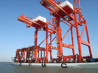 圖為天津港購買的世界上最先進的集裝箱碼頭裝卸設備。隨著天津濱海新區的快速發展,天津港口建設進一步提速,2006年完成固定資產投資76.4億元,今年投資將達85億元,重點建設東疆保稅港區和25萬噸級深水航道。天津港目前已成為世界最大的人工深水港。