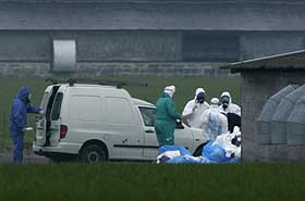 2月5日,在英國東部地區霍爾頓出現禽流感疫情的一農場,工作人員身著防護服裝從一輛小貨車上卸下裝火雞的袋子。英國環境、食品和鄉村事務部當日晚宣布,英國出現禽流感疫情農場的15.9萬只火雞已被全部撲殺。新華社/路透