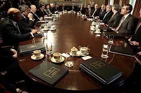 2月5日,在美國首都華盛頓白宮舉行的內閣會議上,幾本美國2008財政年度預算報告被擺在桌子上。當日,美國總統布什向國會提交2008財政年度預算報告時提出總額為7165億美元的軍費申請。新華社/路透