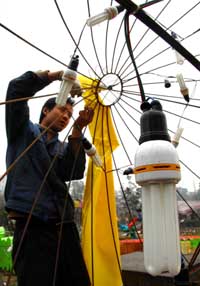 2月6日,工作人員在為安上節能燈的彩燈布置裝飾物。 為降低能耗,今年即將舉辦的第39屆成都燈會所使用的白熾燈全部換上節能燈,預計用電量僅為2006年燈會用電量的一半,節約電費10多萬元。第39屆成都燈會將于2月18日正式亮燈。