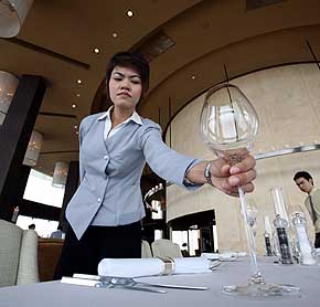 10日,服務員在泰國曼谷的一家餐廳擺放餐具。泰國近日推出11道菜的天價節日套餐,價格高達每人29000美元。新華社/法新