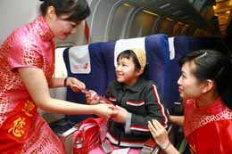 2月14日下午4時,2007年上海航空公司首架兩岸春節包機——上航9501次波音767客機搭載著258名臺胞飛往臺北。圖為兩位空姐在向一位小乘客贈送禮品。