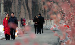2月24日,游客在烏魯木齊市人民公園散步。新疆烏魯木齊市人民公園自2月1日起實行免費開放后受到市民的歡迎。春節期間,這里成為市民和游客娛樂休閑的好去處。
