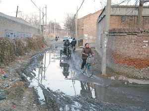 距離濮陽縣政府辦公大樓不到兩公里的落后村莊,污水橫流。 本文照片:新華社記者