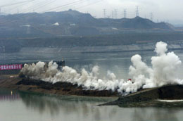 28日,三峽工程右岸下游圍堰成功爆破拆除。三峽下游圍堰爆破拆除后,三峽大壩將實現上下游面全線擋水,為三峽右岸電站首批機組投產發電創造條件。圖為三峽工程右岸下游圍堰爆破的瞬間。