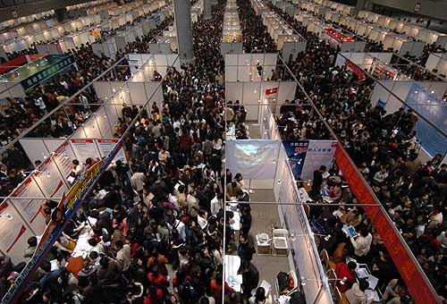 3月4日上午拍攝的人才交流大會現場。2007年重慶春季人才交流大會當天在重慶國際會展中心舉行。500余家參展單位提供了10000余人就業崗位,招聘現場人滿為患。
