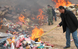 3月14日,工作人員在焚燒假冒偽劣商品。當日,青海省工商行政管理部門展開全省銷毀假冒偽劣商品統一行動,總案值近300萬元的假冒偽劣食品、藥品、煙、酒、書籍、光盤等被銷毀。