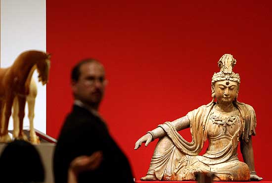 15日,一尊中國木雕造像在美國紐約克里斯蒂拍賣行展出。這尊“水月觀音”木雕造像是中國11至13世紀的作品,預計拍價在60萬至80萬美元。紐約克里斯蒂拍賣行將于3月22日拍賣中國古董,拍品包括木雕、陶瓷器、玉器、服飾等,總拍價預計將超過1200萬美元。