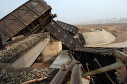 3月18日15時40分許,由烏魯木齊北約70公里的阜康開往烏魯木齊火車北站的專線運煤列車在阜康市境內經過一鐵路橋梁時,橋梁坍塌,機車頭后部有九節運煤車廂脫軌,其中八節側翻,三節墜落河中。截至當日17時,沒有人員傷亡的報告。目前烏魯木齊鐵路局和阜康市有關部門已趕到現場處理事故。事故原因尚在進一步調查中。