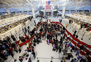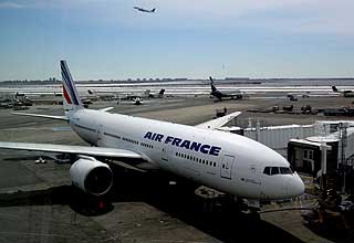 左圖:3月19日,一架法航客機在美國紐約肯尼迪國際機場停泊。 右圖:3月19日,旅客在美國紐約肯尼迪國際機場排隊等待安檢。