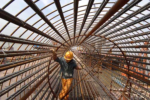 3月21日,一名工人在檢查即將吊裝的橋梁樁基鋼筋網。目前,居世界同類型橋梁第三的湖北鄂東長江公路大橋正加緊建設。該橋位于長江水道湖北省黃石市上游,全線跨黃石、鄂州、黃岡三市。該橋為雙塔雙索面混合梁斜拉橋,投資約28億元,主跨長926米,計劃于2010年10月建成通車。