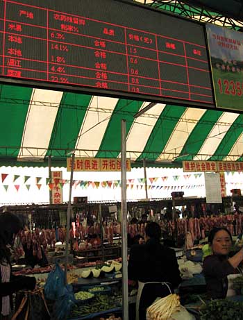 3月26日,成都黃忠農貿市場的電子顯示屏滾動顯示著當日菜果的產地、農藥殘留量、平均售價等信息。成都市物價局近日在部分農貿市場試行明碼標價,市民可參照商品的質量和價格自由選擇購買。