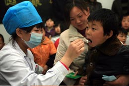 3月23日,北京市豐臺區醫務人員在振華民生學校為流動兒童進行脊髓灰質炎(小兒麻痹)的接種。當日,北京市豐臺區衛生局啟動了“一個都不能少——-為流動兒童送健康”主題活動,免費為該地區的流動兒童進行流腦、麻疹和脊髓灰質炎(小兒麻痹)等傳染病的預防接種。預計到今年4月20日,豐臺區將完成對全區3萬名流動兒童免費接種防病疫苗。