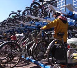 4月2日,工作人員在北京崇文門附近的一個自行車存放處安裝雙層自行車停放裝置。這種雙層自行車裝置不僅可以在有限的空間內停放更多的自行車,還可以更好地保證自行車的安全,使用者可以通過拉桿輕松地存取車輛。