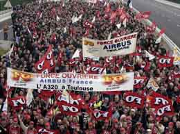 4月3日,在法國圖盧茲市的布拉尼亞克機場附近,歐洲空中客車公司的員工舉行游行示威,抗議空客的重組計劃。根據重組計劃,空客將在歐洲裁員一萬人,其中法國4300人。
