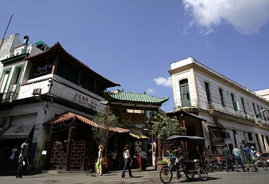 3日,人們在古巴首都哈瓦那的華人街上行走。在哈瓦那有一條具有濃厚中國特色的華人街。高懸的大紅燈籠,傳統的街道牌坊,地道的中國小吃,工整的金字對聯,讓這條華人街成為哈瓦那一道獨特的風景。