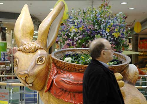 4日,在德國首都柏林的一家商場,一名顧客從一只復活節兔子雕像旁走過。復活節將至,柏林各商場都以復活節為主題裝點店面,喜迎這一初春的節日。