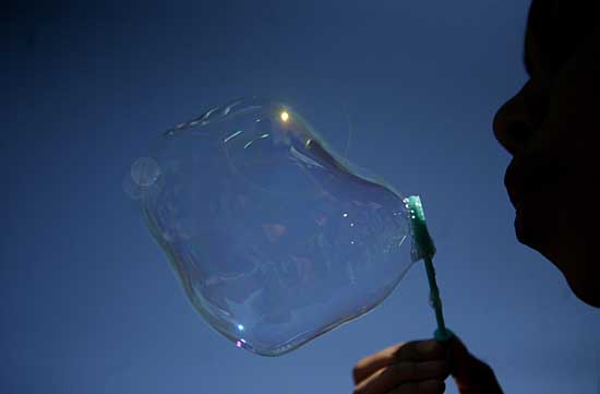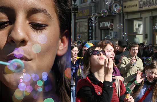 在美國紐約和俄羅斯首都莫斯科人們紛紛走上街頭吹起五彩的泡泡,享受春日的溫暖。