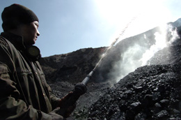 4月8日,在烏魯木齊縣松樹頭煤田火區,天山大峽谷公司的一名工人正在用水“滅火”。據介紹,煤田滅火是一項危險大、難度很高的工作,需要一整套的工藝,這種“灑水”滅火根本無濟于事。