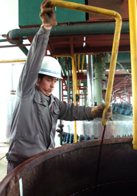 近日,江西新時代油脂工業有限公司創新工藝、自行設計生產的生物柴油生產線投產,預計年生產能力可達1.8萬噸。這種創新工藝生產出的生物柴油可單獨或混合石化柴油供車輛使用。這種新工藝為廢油再利用提供了新出路。圖為工作人員在生物柴油生產線上操作。
