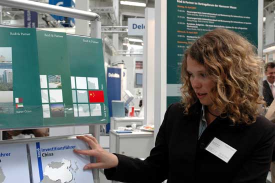 16日,在德國漢諾威,全球著名的會計師事務所羅德及合伙人集團工作人員在漢諾威工業博覽會的展臺前展示介紹中國投資環境的刊物。德國漢諾威工業博覽會15日開幕,中國共有400家企業參展。