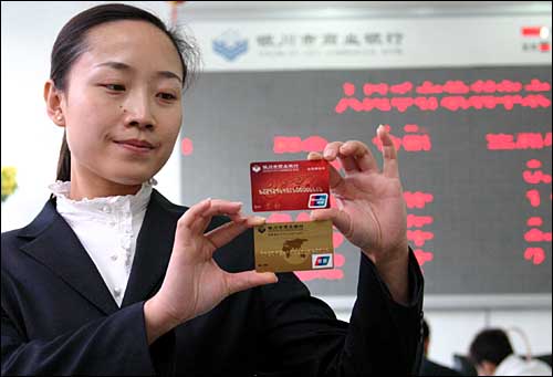 4月23日,銀川市商業銀行工作人員對比新舊銀聯如意借記卡。中國銀聯從7月1日起,將停止“94”字頭如意借記卡的跨行取款和刷卡消費業務。新卡片磁條信息上除了記錄持卡人的個人資料之外,還添加有CVN校驗碼,該校驗碼是防范克隆卡和偽卡交易的重要手段,可保護持卡資金安全。凡持“94”字頭的如意借記卡客戶須到銀行各網點免費更換新標準如意借記卡。