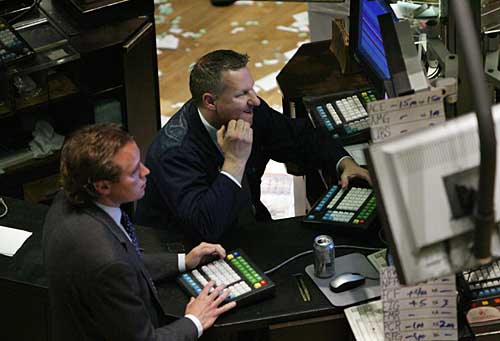 24日,兩名交易員在美國紐約證券交易所股票交易大廳工作。當日紐約股市收盤時,道瓊斯指數較前一個交易日上漲34.54點,收于12953.94點,漲幅為0.27%。道瓊斯指數盤中曾創下12989.86點的歷史新高,步步迫近13000點大關。