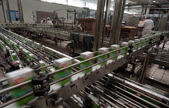 近年來,有“中國乳都”之稱的內蒙古呼和浩特市依托伊利、蒙牛兩大奶業巨頭實施“奶業興市”發展戰略,在國內乳業市場創造了輝煌。2006年,伊利、蒙牛兩家乳業公司全年總收入之和超過了320億元人民幣,在國內乳業市場份額中幾乎占據了半壁江山,產品遍布全國各地。 圖為伊利的現代化生產車間(攝于4月28日)。