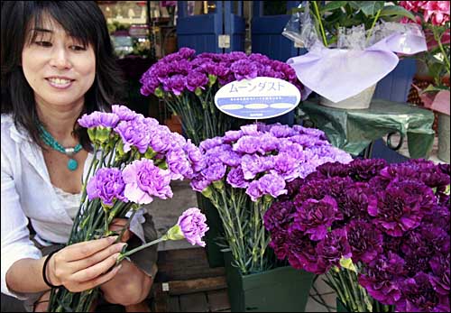 9日,日本東京街頭一家花店的店員展示名為“月球塵!钡暮币娝{色康乃馨。這種康乃馨由日本和澳大利亞的公司聯合開發,隨著母親節的臨近開始投放市場。