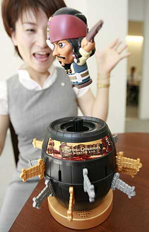 日本東京一家玩具公司的職員演示該公司新推出的玩具“海盜飛人”。這款玩具根據電影《加勒比海盜》設計,海盜小人以影片主人公杰克船長為原型。如果玩家拔錯插在桶上的刀,藏在桶中的杰克船長就會飛出來。