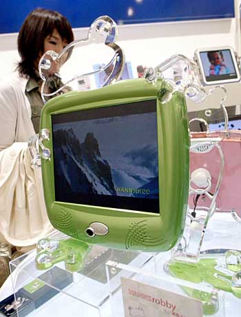 12日,在日本首都東京商業街六本木的一家電器商店,顧客選購青蛙造型的液晶電視。這家商店最近新推出了一系列薯條、手提包、直升機、消防車等卡通玩具造型的液晶電視,電視大小從9.6英寸到42英寸不等,售價比普通電視稍高一點,成為很多家長裝飾兒童房間的選擇。