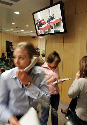 5月10日,在俄羅斯首都莫斯科的俄羅斯石油公司總部新聞中心,媒體記者觀看競拍直播。由俄羅斯政府控股的俄羅斯石油公司當天在俄羅斯尤科斯石油公司薩馬拉地區資產的競拍中勝出。