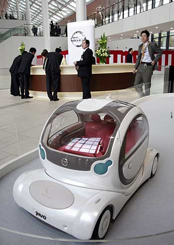 15日,在日本神奈川縣厚木市日產公司高科技中心,參觀者走過一款名為“Pivo”的概念電動車模型。該車車廂可以360度旋轉,免除了倒車的麻煩。當日,日產汽車公司高科技中心向公眾開放,該中心致力于推動環保型汽車的發展。