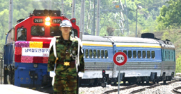 5月17日,在韓國汶山站,一名韓國軍人在即將參加京義線試運行的韓國列車旁警戒。韓朝雙方當天同時舉行連接朝鮮半島南北方的京義線鐵路和東海線鐵路試運行儀式。來自韓國和朝鮮的列車分別從韓國汶山站和朝鮮金剛山站出發,進行56年來首次跨越韓朝軍事分界線的列車運行。