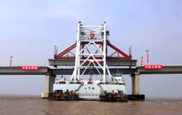 5月21日,目前世界上最長的跨海大橋——杭州灣跨海大橋混凝土結構施工全面完成。杭州灣跨海大橋北起浙江海鹽、南至浙江寧波,全長36公里,總投資118億元,預計2007年建成,2008年通車。圖為“小天鵝”架梁船正將最后一片2200噸重、70米長的巨型箱梁架設在跨海大橋的橋墩上。