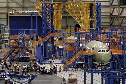 21日,在美國華盛頓州埃弗里特的波音飛機裝配工廠,工作人員組裝首架夢幻787飛機。波音公司將于7月8日在這里舉行儀式,正式推出外界期待已久的夢幻787。夢幻787是一種中型飛機,由于采用了大量碳物質材料而大大減輕了機身重量和運行成本。