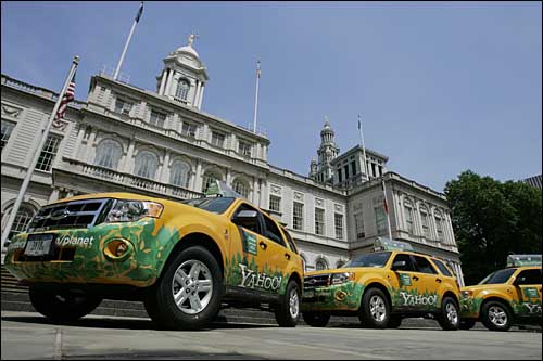 22日,由一家公司捐贈的3輛福特牌混合動力出租車停在美國紐約市政廳前。紐約市市長布隆伯格宣布,紐約所有出租車將在2012年前全部改用混合動力。出租車和轎車委員會也將在今后4年的時間里對出租車執行尾氣排放和車輛行駛里程的新標準。