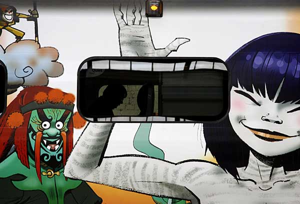 29日,在英國倫敦尤斯頓車站,一位乘客坐在車身外畫滿漫畫的列車車廂內。近日,一位英國設計師以大幅漫畫的形式為他的最新歌劇作品《猴子:西游記》在列車車廂外做宣傳。