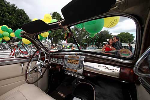 3日,在委內瑞拉的馬拉凱市,參觀者在各式老爺車前留影。委內瑞拉文化部主辦的第一屆國際收藏和古董博覽會當天在馬拉凱開幕,博覽會上舉行了老爺車游行、老照片展覽以及其他一些機構和私人收藏品的展覽。