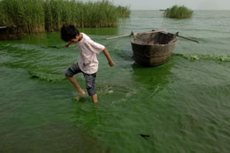 6月4日,一名村民從巢湖里上岸,岸邊的水已泛起綠色。目前巢湖水質出現不同程度的富營養化,局部區域有藍藻出現。安徽省環保部門已下發通知,要求加強巢湖水質監測和預警,強化污染源的日常監管,做好應急準備工作。