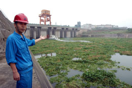 6月7日,青居電站工作人員介紹水葫蘆“入侵”的情況。