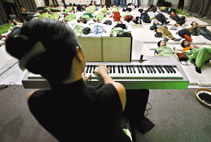 | 3月9日,在西班牙首都馬德里舉行的一場“睡眠”音樂會上,一名日本鋼琴家在眾多逐漸進入夢境的聽眾前演奏。這名鋼琴家在音樂會上演奏舒緩的音樂,讓聽眾精神完全放松而進入夢鄉,最新研究顯示英國人普遍睡眠不足。 | 本報綜合報道